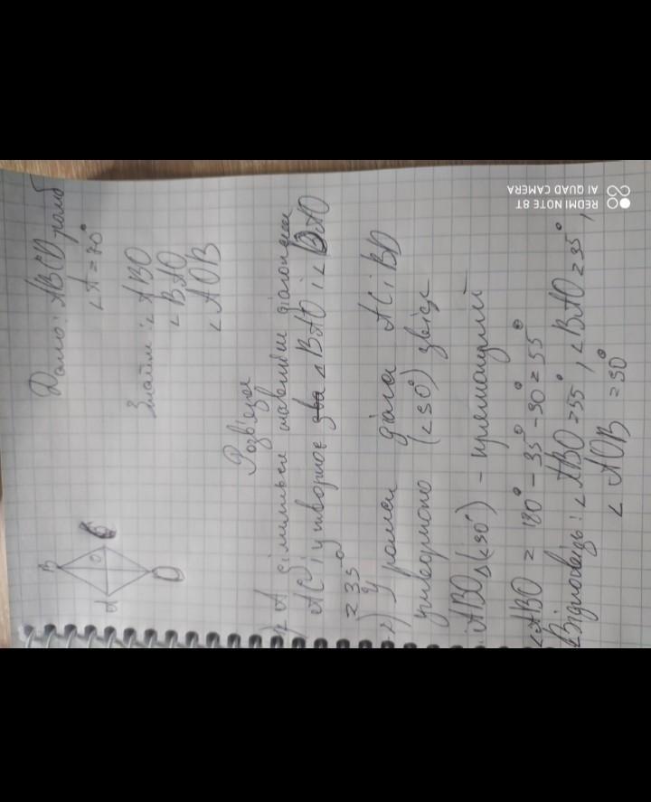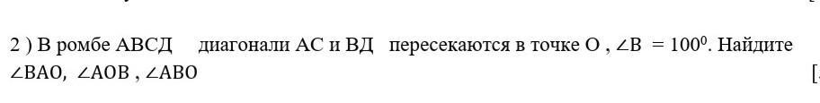 ) В ромбе АВСД диагонали АС и ВД пересекаются в точке О , ∠В = 100° Найдите ∠ВАО, ∠АОВ , ∠АВО