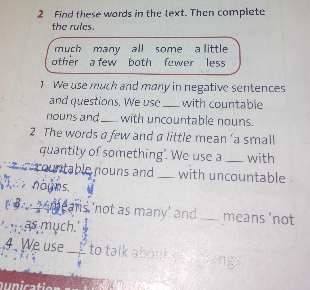 find these words in the text then complete the rules much many all some a little other a few both fewer less