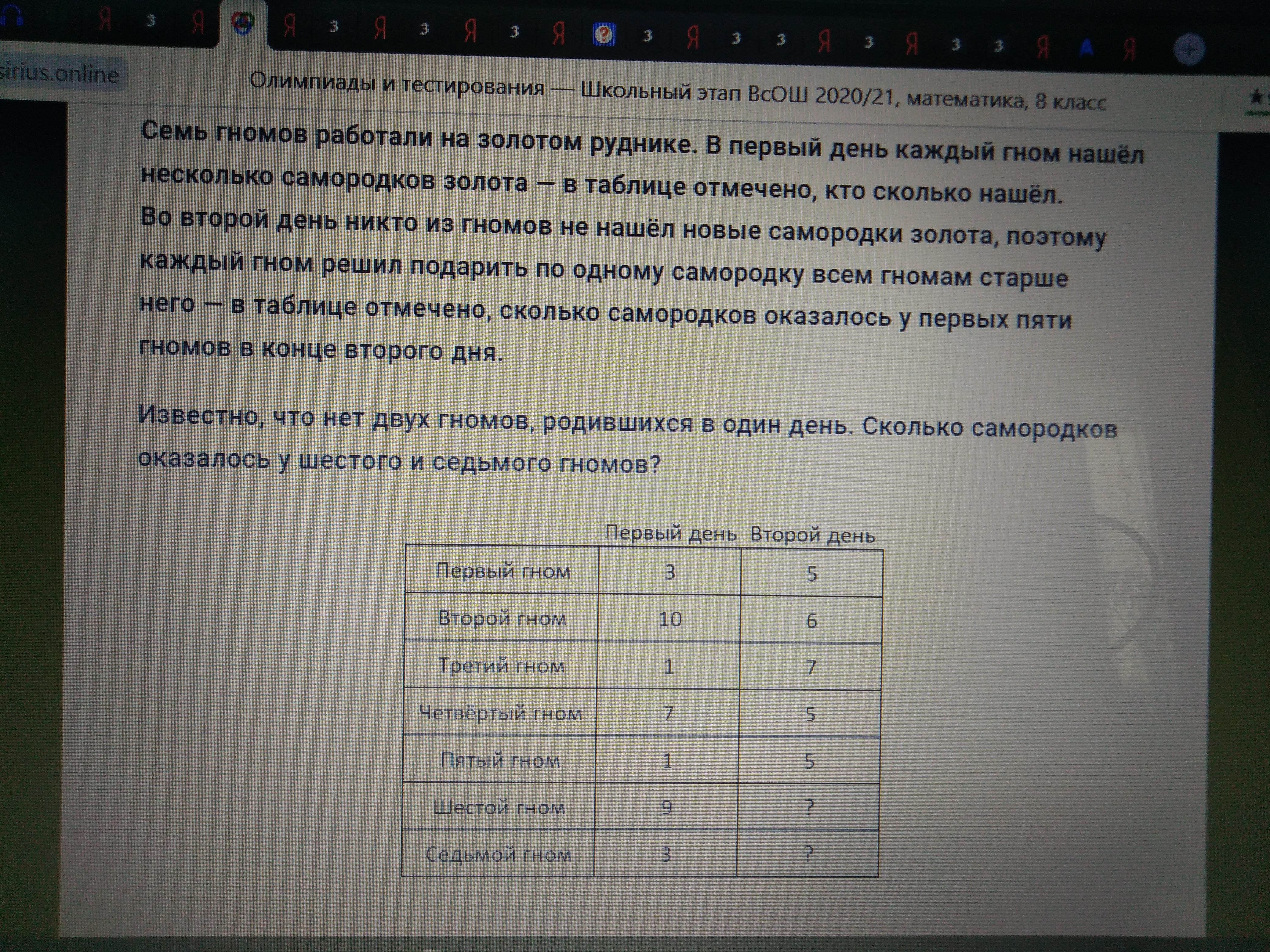 Для шестого и седьмого гномов остается 2 варианта: средний и самый младший. Седьмой не может мыть самым младшим, т.к. у него всего 3 самородка и он не может отдать 6. Отсюда: