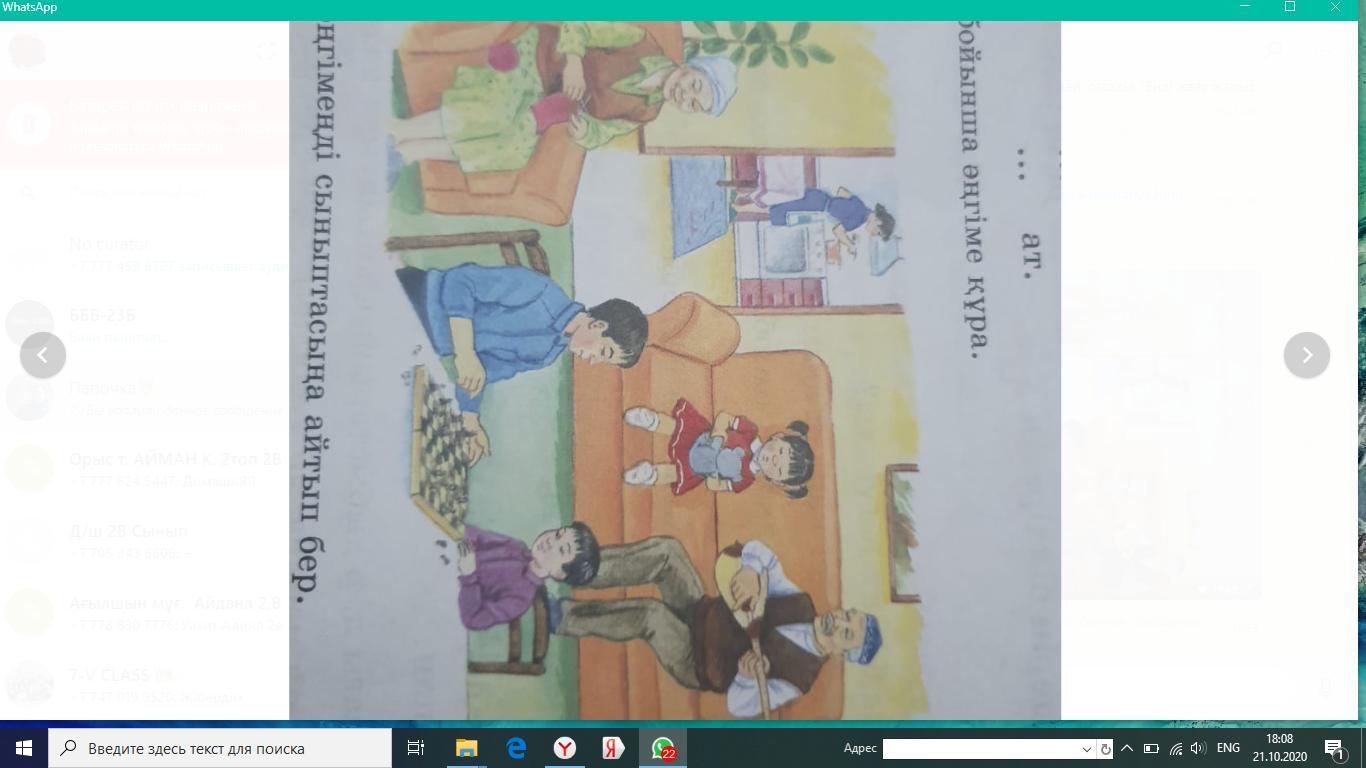 Әкем жұмыста.Бңз ағам екеуміз шахмат ойнап отырмыз.Ал қарындасым болса белла деген қуыршағымен ойнап отыр.Атам ән айтып домбыра тартуда.Әжем болса қарындасыма жилетка тоқып жатыр.Анам болса түскі ас дайындауда.