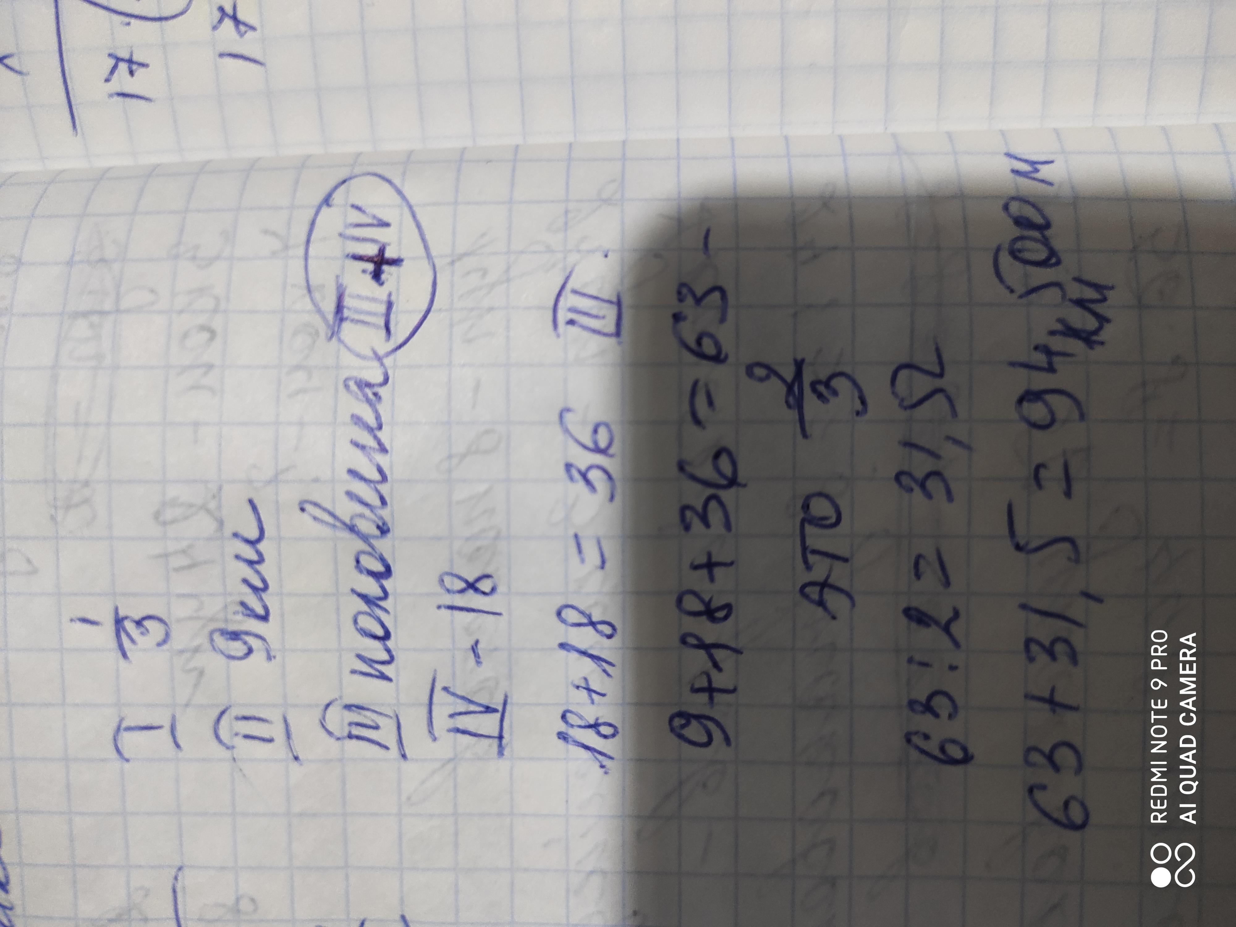 Турист должен пройти маршрут в 4 этапа. Первый этап составляет треть маршрута, второй 9 км , третий -половина из того что осталось, а четвертый - остальные 18 км. Найди длину маршрута.