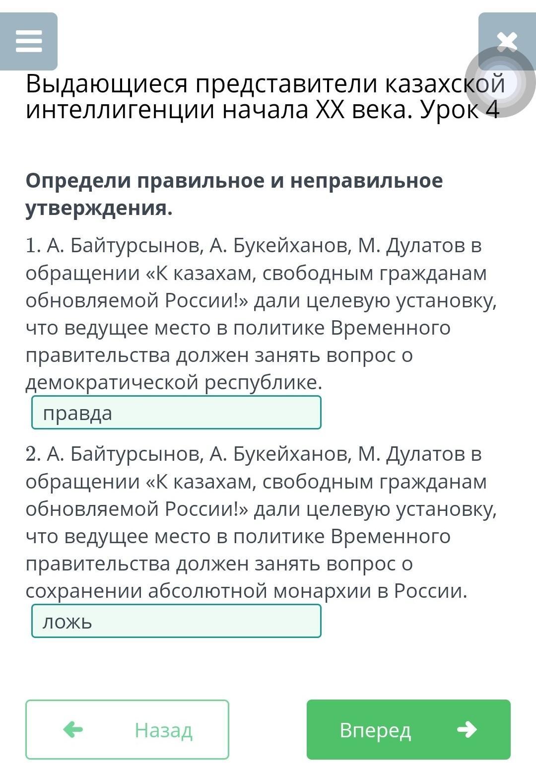 2. А. Байтурсынов, А. Букейханов, М. Дулатов в обращении «К казахам, свободным гражданам обновляемой России!» дали целевую установку, что ведущее место в политике Временного правительства должен занять вопрос о сохранении абсолютной монархии в России.