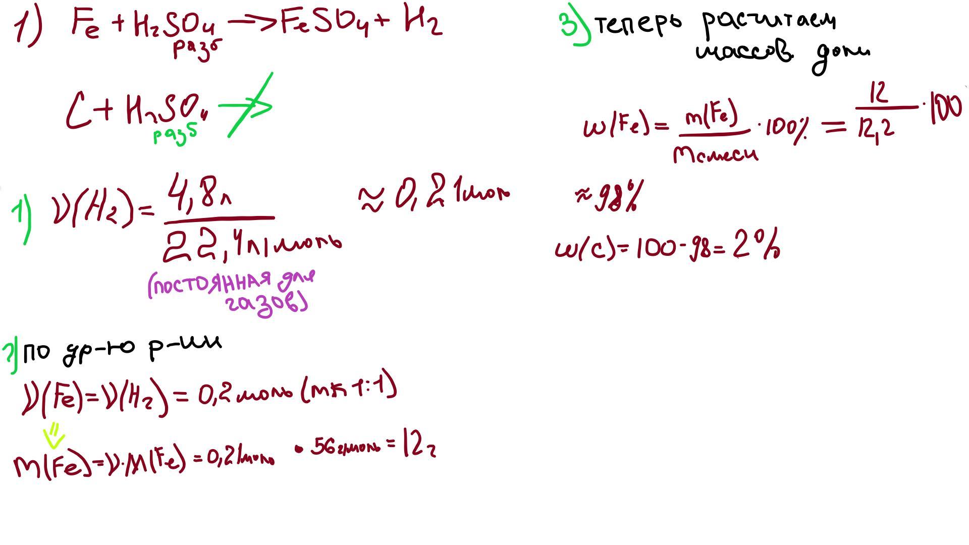 при растворении 12,2 г сплава железа с углеродом в разбавленной серной кислоте выделилось 4,8 л газа. Определите состав сплава в %