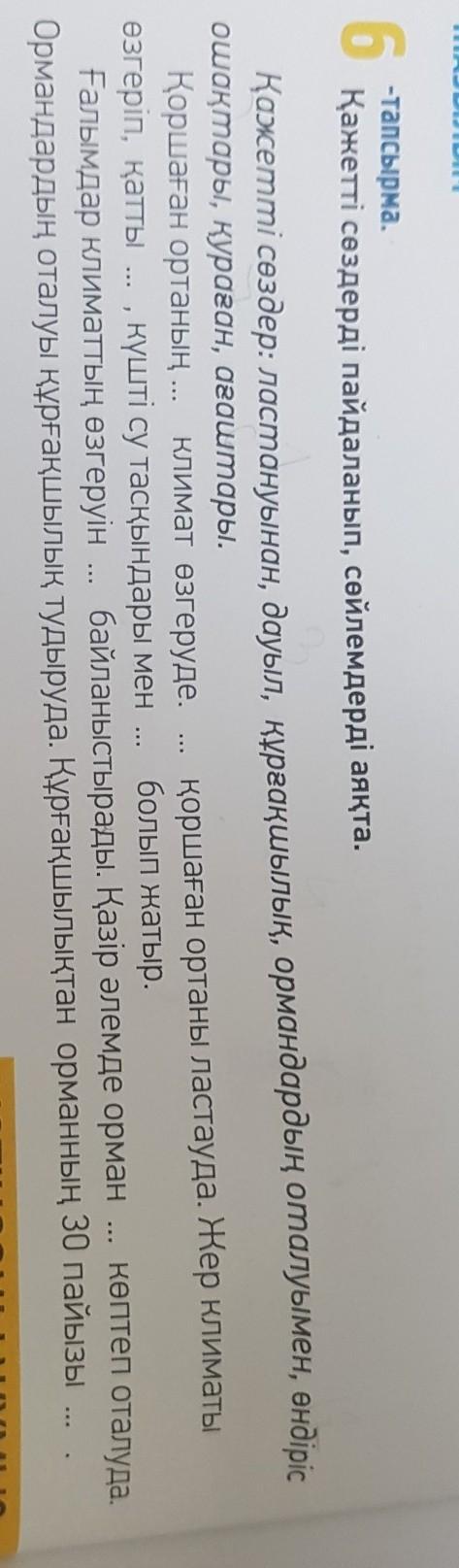 Қажетті сөздер: ластануынан, дауыл, құрғақшылық, ормандардың оталуымен, өндіре