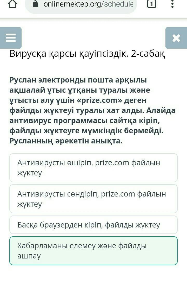 Руслан электронды пошта арқылы ақшалай ұтыс ұтқаны туралы және ұтысты алу үшін «prize.com» деген файлды жүктеуі туралы хат алды. Алайда антивирус программасы сайтқа кіріп, файлды жүктеуге мүмкіндік бермейді. Русланның әрекетін анықта.