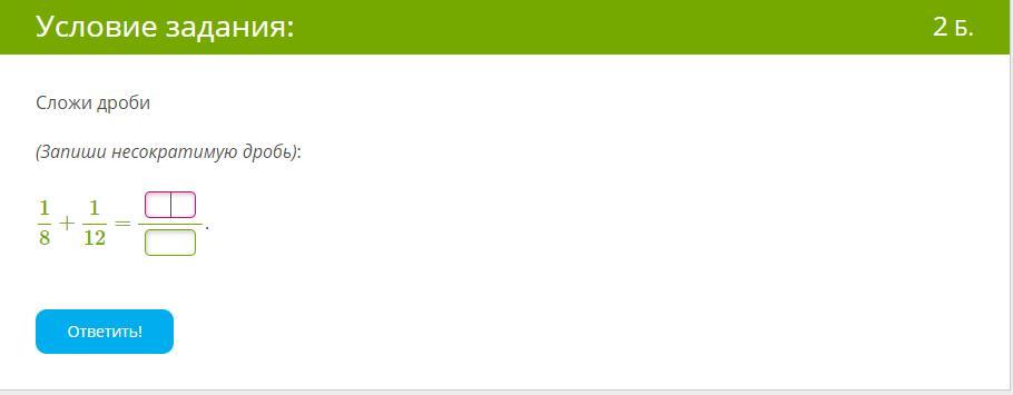 12/8 не делится Так что мы берем и методом подбора число 24 это число делится и на 8 и на 12. Это число нас будет общим знаменателем этот общий знаменатель мы должны поделить на 8 у нас получается 3 это число мы умножаем на числитель то есть верхние число затем списываем число 24 как знаменатель у нас получается: