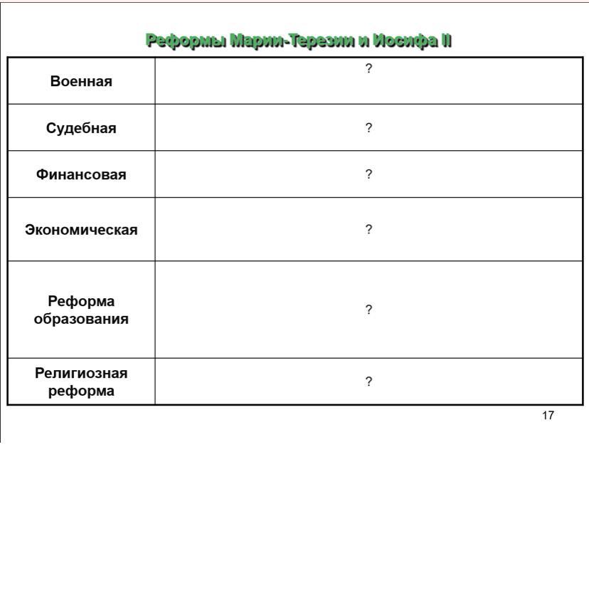 образовательная: начало система Общей школьного образования; основано народные школы для простых людей, ремисничи и сельскохозяйственные училища, реформирована гимназии, Открыт университеты, которые звильнялися от влияния иезуитов;