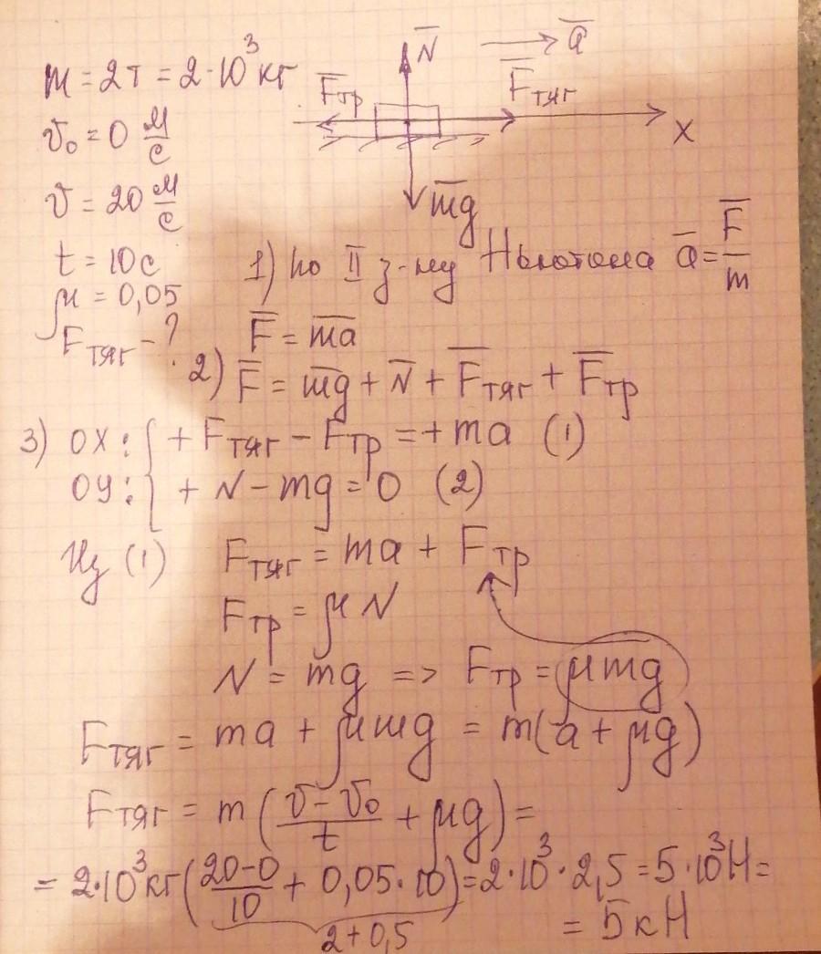 Автомобиль массой 2 т, трогаясь с места, достигает скорости 20 м/с за 10 с. Найти силу тяги двигателя, если коэффициент трения равен 0,05.