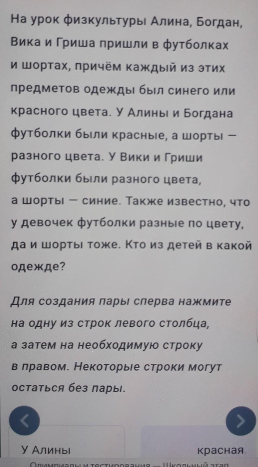 алина в футболка красная , а шорты синие , у Богдана футболка красная и шорты красные , у Вики шорты синие и футболка синяя , у Гриши шорты шорты синие , а футболка красная