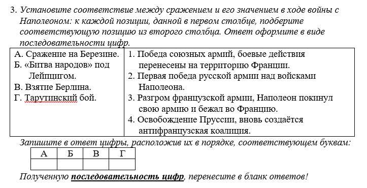 -Установите соответствие между сражением и его значением в ходе войны с Наполеоном: к каждой позиции, данной в первом столбце, подберите соответствующую позицию из второго столбца. Ответ оформите в виде последовательности цифр.