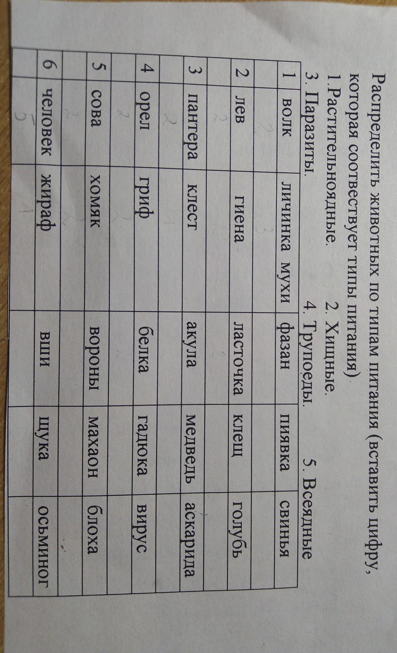 пж помогите надо Распределить животных по типам питания ( вставить цифру, которая соответствует типу питания)