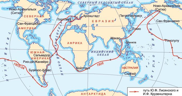 На карте видно, что в процессе путешествия, проплыв Тихий океан, были достигнуты берега Ново-Архангельска (Ситка), затем был достигнут полуостров Индокитай г.Макао, а после был достигнут юг Африки в г.Кейптаун (рядом с м.Доброй Надежды).