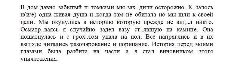 В дом давно забытый потомками мы заходили осторожно. Казалось ни одна живая душа никогда там не обитала но мы шли к своей цели. Мы окунулись в историю которую прежде не видел никто. Осматриваясь я случайно задел стеклянную вазу стоявшую на камине. Она пошатнулась и с грохотом упала на пол. Все напряглись и в их взгляде читались разочарование и порицание. История перед моими глазами была разбита на части а я стал виновником этого уничтожения.