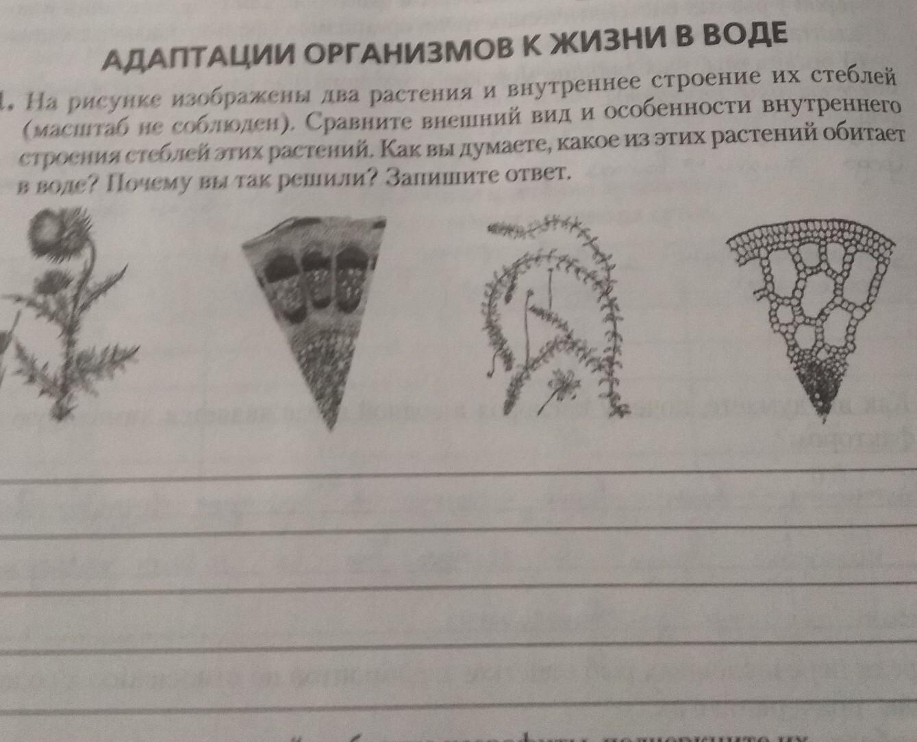 Первое растение-покрытосеменное, второе- моховидное. У моховидных растений простое строение и они зависят от воды. У покрытосеменных развитая проводящая ткань. И они не зависят от воды.