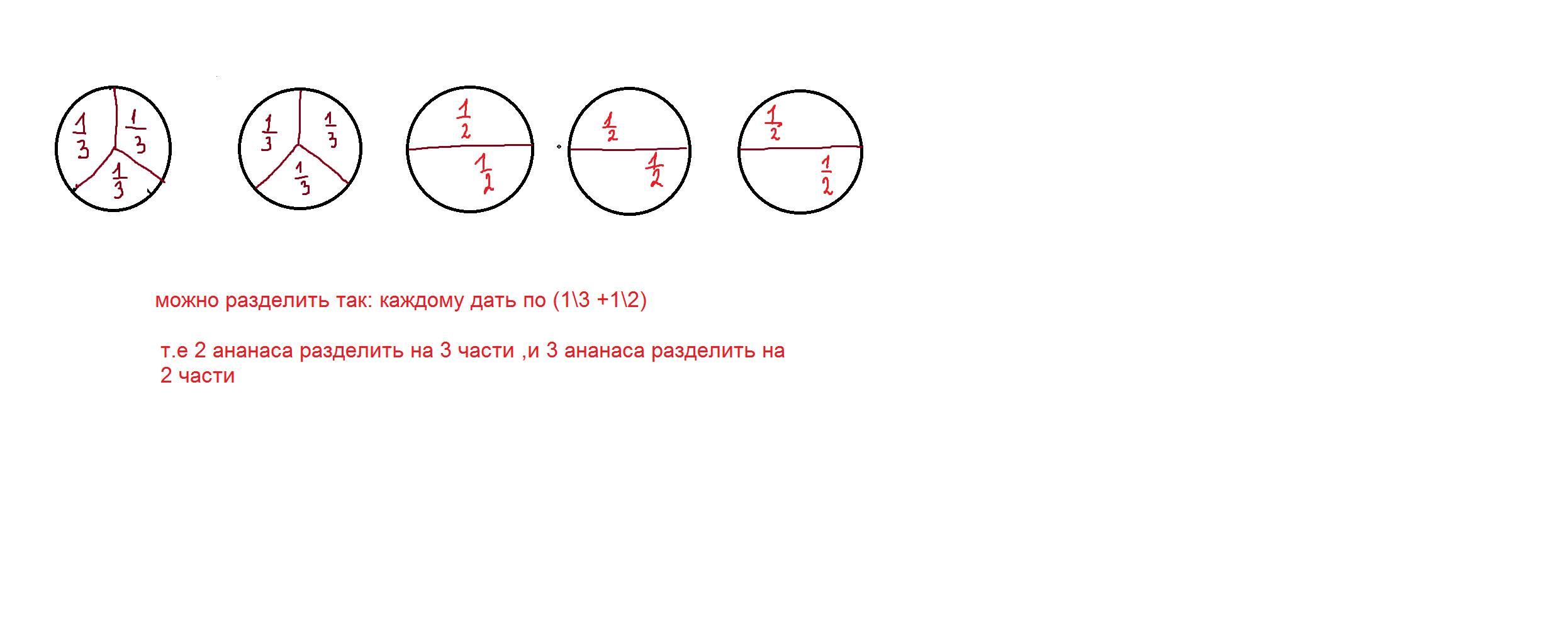 який розділити порівну 5 ананасів між 6 дітьми, якщокожний ананас можна розрізати не більше, ніж на три рівні частини?