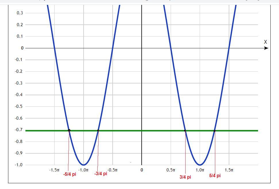 По заданию функция меньше -√2/2, поэтому значение аргумента лежит левее и правее точки, где функция равна -1 на величину (π/4).