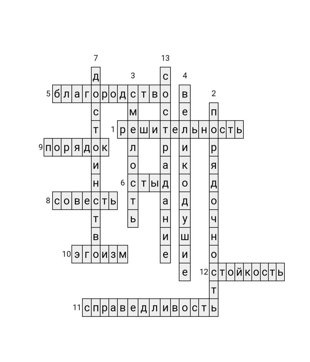 Составить кроссворд из слов: порядочность, порядок, справедливость, стойкость, смелость, решительность, благородство, достоинство, великодушие, совесть, стыд, сострадание, эгоизм.