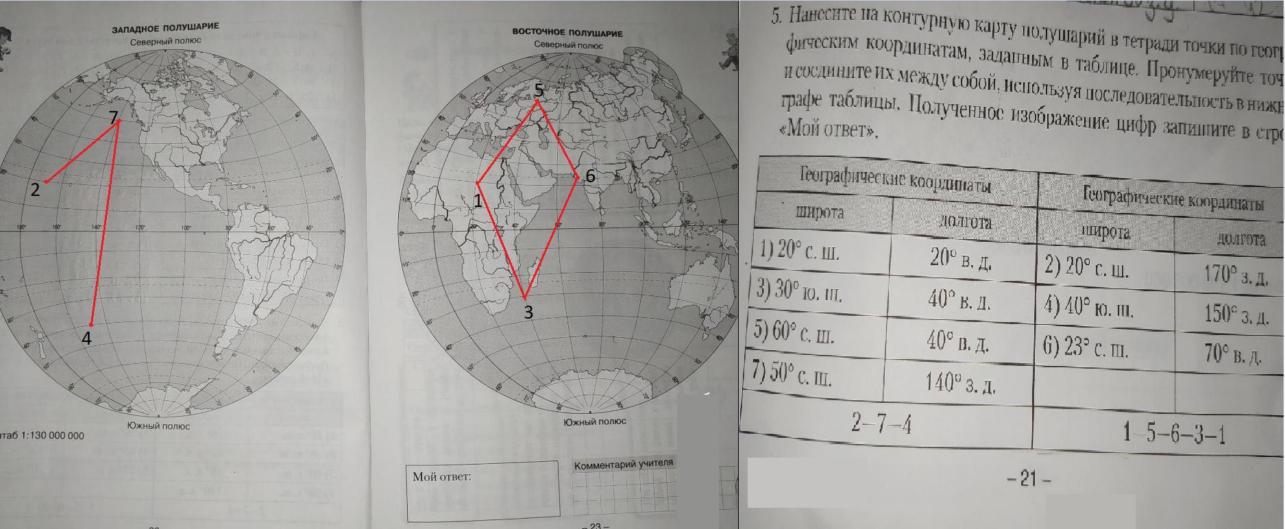 Нанесите на контурную карту полушарий в тетради точки по геогра-