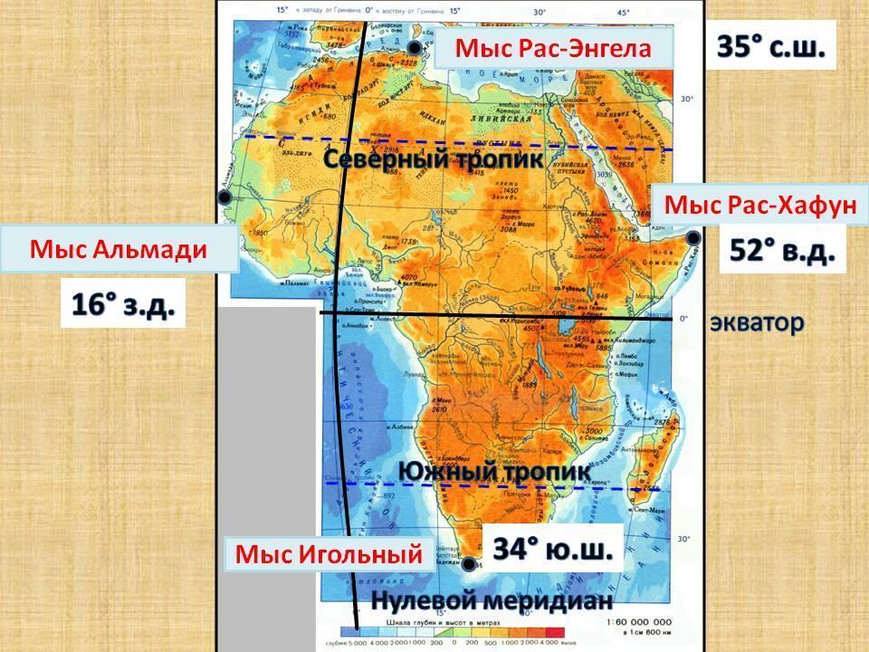 Африка пересекается экватором почти посередине, пересекается Северным и Южным тропиками, пересекается 0 меридианом.