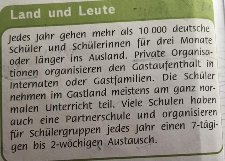 Перевод: Ежегодно более 10 000 немецких школьников уезжают за границу на три месяца и более. Частные организации организуют проживание в интернатах или в принимающих семьях. Учащиеся в основном участвуют в обычных уроках в принимающей стране. Многие школы также имеют партнерские школы и ежегодно организуют от 7 до 2 недель обмена для школьных групп.