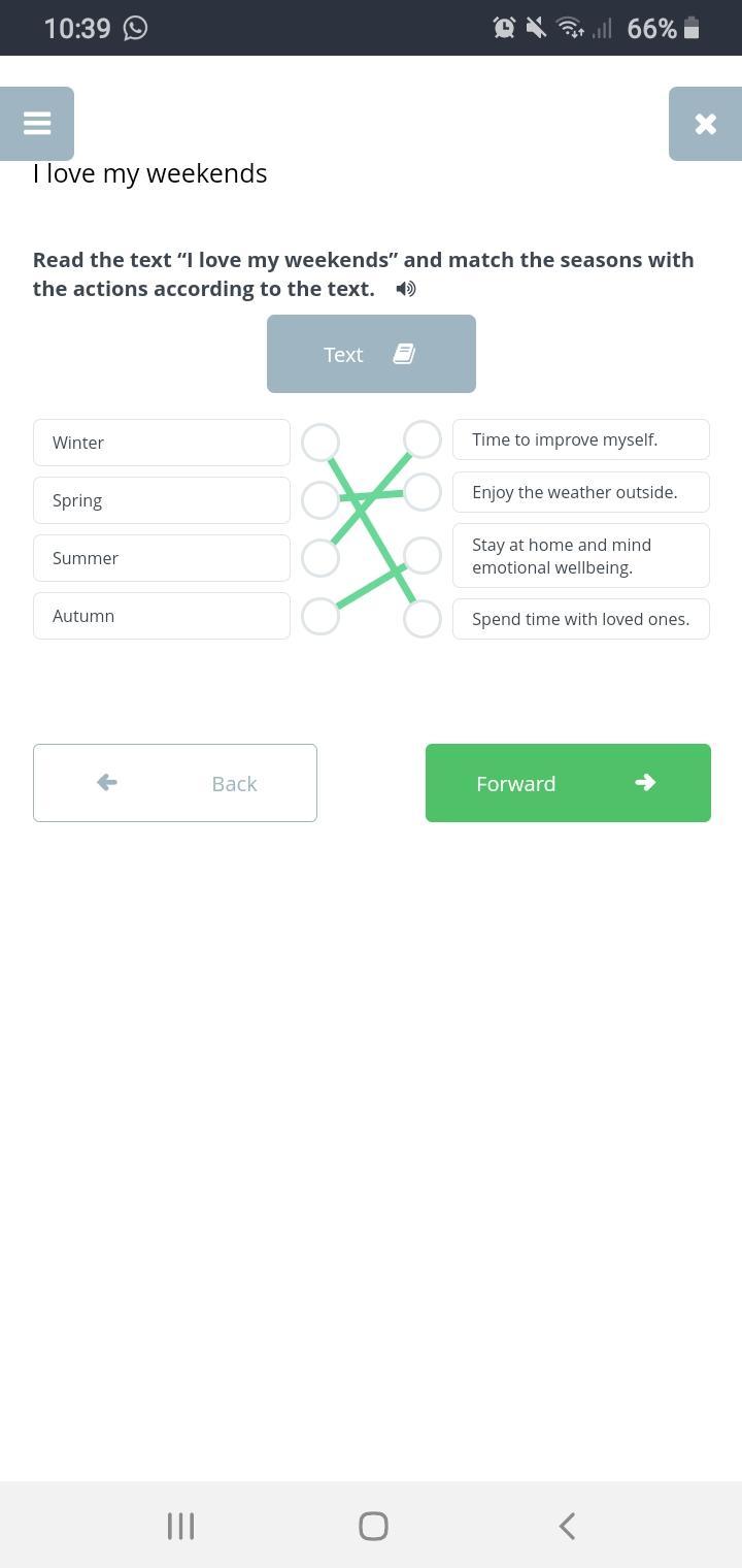 I love my weekends Read the text “I love my weekends” and match the seasons with the actions according to the text. I love my weekends Winter Winter is a time for cozy family dinners. People spend their weekends doing memorable things with their loved ones. My tradition during winter weekends includes visiting my grandparents where my entire family unites. Moreover, winter is associated with the Christmas holidays. So I put on my favorite socks and a woolen sweater and play some relaxing songs of the season. The opportunity for holidays often lights up the desire to travel. My family enjoys the snowy areas and activities such as skiing and skating. Overall, winter is the right time to try something new. Spring Spring weekends are the loveliest and most pleasant days. The beauty of nature in that season inspires me to be creative. I have been obsessed with photography for quite a while already, so I spend most of my spring weekends outside enjoying the weather and taking pictures of the prettiest places in our countryside. Also, unlike the winter, spring is a great opportunity to experiment with clothes, because I do not have to wear heavy coats, but at the same time, I can try some new and classy outfits. Summer Because of the relatively high temperatures during June and July, I do not like to be outdoors. I used to spend my holidays at home, but I got bored. I realized that there are a lot of activities that might keep me interested and busy during the holidays. Just recently I've signed up for art classes and joined a sports club. Summer became my own time to improve myself and be a better person. When I hang out with my friends, light clothing is a must for me. During summer I appreciate every minute of my vacation and try to spend the time usefully. Summer vacation means lot of fun. Autumn To me, autumn weekends are rather sad, as the schools reopen. It is the laziest season of the year for me. I use the time to think about my future and plan for it. Sometimes, I spend autumn weekends sleeping late, watching TV and playing computer games. I do not go out much during this time. I prefer staying at home, so I wear cozy clothes, being comfortable in every way. Being indoors, I do my domestic chores and mind my clothing and emotional wellbeing. Thankfully, fall weekends never last long. пжалусто мне очень нужно