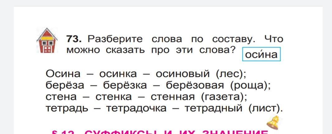 Ответ: осина - 1корень осин, окончание а, основа осин, осинка- корень осин, суффикс к, окончание а, основа осинк, осиновый- корень осин, суффикс ов, окончание ый, основа основ, берёза- корень берёз, окончание а, основа берёз, берёзка- корень берёз, окончание а, суффикс к, основа берёзк, берёзовая- корень берез, суффикс ов, окончание ая, основа берёзов, у каждой строчки один корень