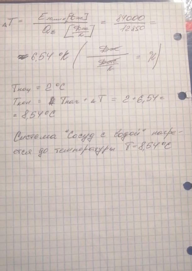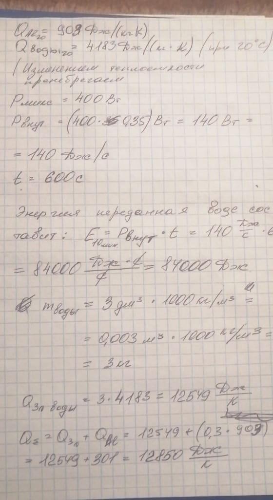 ≠В алюминиевом сосуде массой 300 г миксером перемешивают воду объемом 3 дм3, взятую при температуре 2 °С. Мощность миксера равна 400 Вт. Считайте, что 35% механической энергии переходит во внутреннюю. До какой температуры нагреется вода, если миксер работает на протяжении 10 минут?