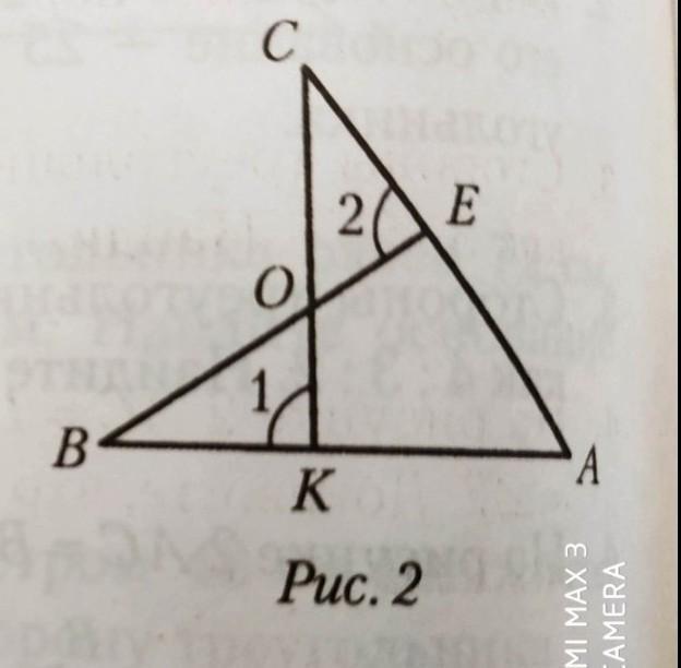 Дано: АК=КЕ , угол 1 = углу 2 ; доказать , что В = С Решение : АК=АЕ , угл а общий , угл ВЕК = углу АКС , как смежные углы равных углов, угл АВЕ = АСК по 2 признаку , значит В = С