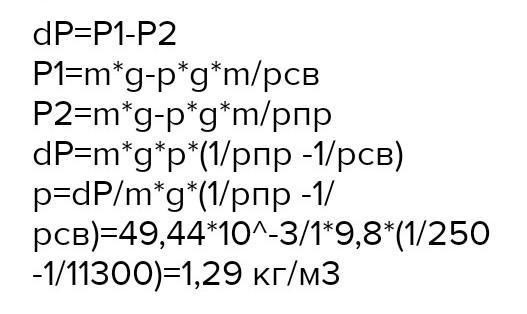 p=dp/m*g*(1/pпp-1/pcв)=49,44*10^-3/1*9,8*(1/250-1/11300)=1,29кг/м3