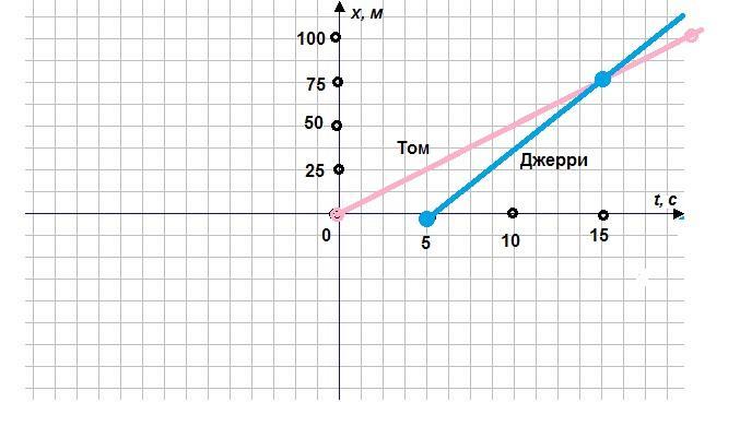 1. Мышонок Том, подкравшись к спящему коту Джерри, дернул его за ус и бросился бежать со скоростью 5 м/с. Проснувшись, Джерри через 5 секунд побежал за Томом со скоростью 7,5 м/с. Постройте графики зависимости пути Тома и Джерри от времени. Сколько продлится погоня? ДАЮ 50 БАЛЛОВ,НУЖНО С КРАТКОЙ ЗАПИСЬЮ