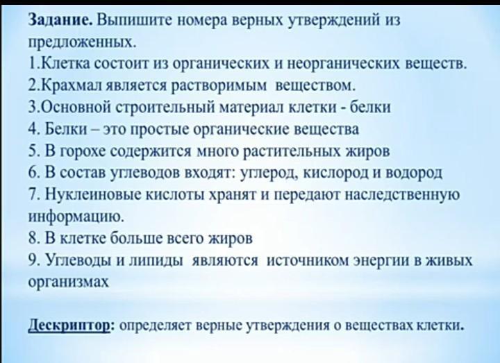 1. Клетка состоит из органических ( углеводы, белки, жиры и нуклеиновые кислоты) и неорганических веществ (вода, минеральные соли)