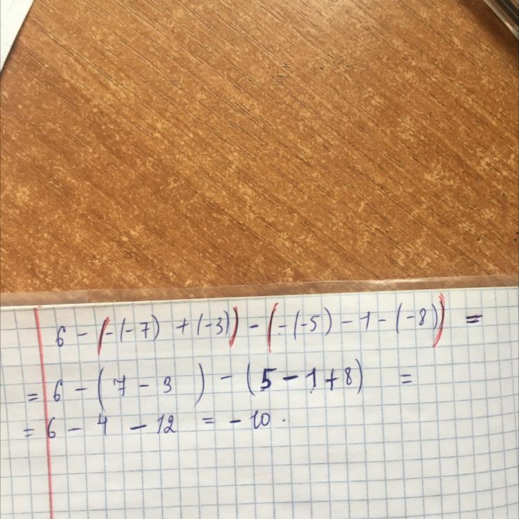 6 – (–(–7) + (–3)) – (–(–5) – 1 – (–8)) = 6 - 7 - 3 - 5 - 1 + 8 = - 2