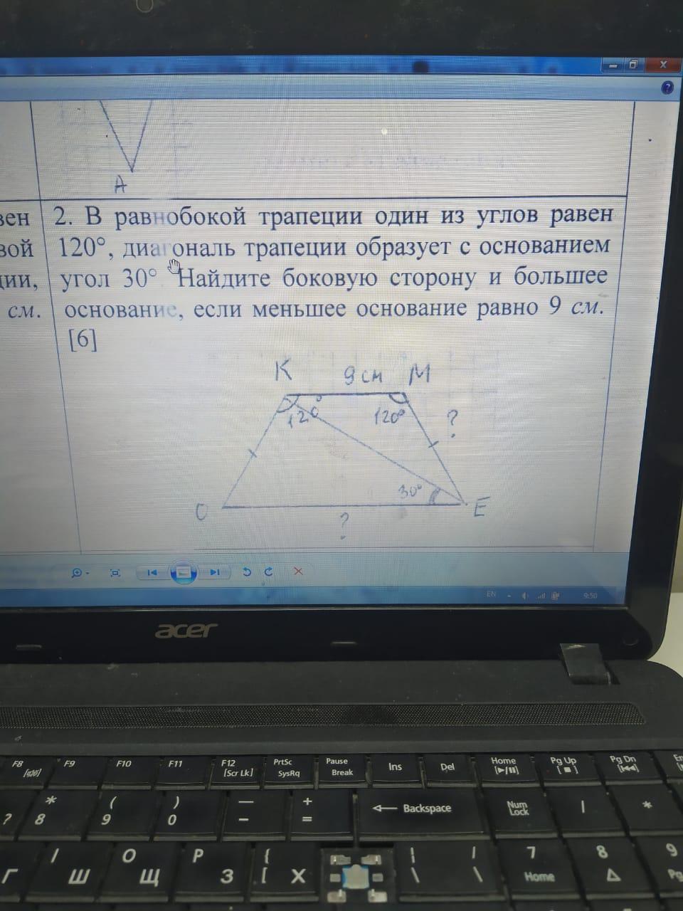 В равнобокой трапеции один из углов равен 120°, диагональ трапеции образует с основанием , угол 30° Найдите боковую сторону и большее основание, если меньшее основание равно 9 см.