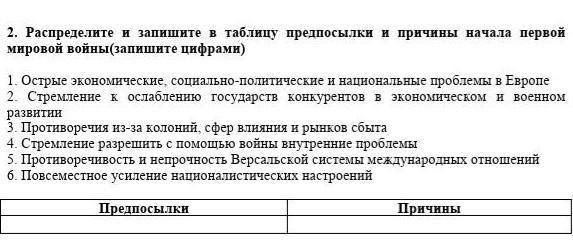 Распределите и запишите в таблицу предпосылки и причины начала первой мировой войны(запишите цифрами)