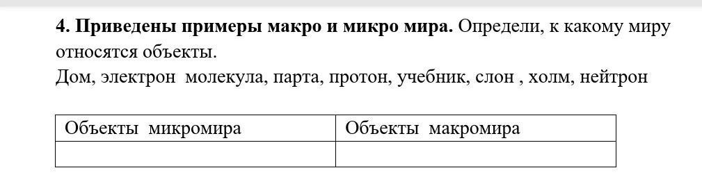 Объекты макромира:дом,парта,учебник,слон,холм.