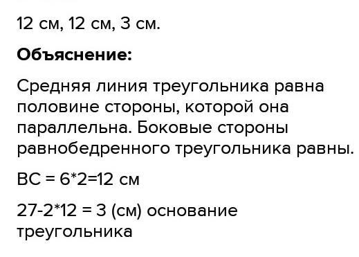 Периметр равнобедренного треугольника равен 27 см, средняя линия MN, параллельная боковой стороне ВС, равна 6 см. Найдите все стороны треугольника.