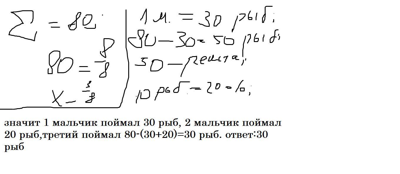Три хлопчики піймали 80 карасів. Перший хлопчик піймав 3/8 усієї кількості карасів, другий - 40% решти. Скільки карасів піймав третій хлопчик?