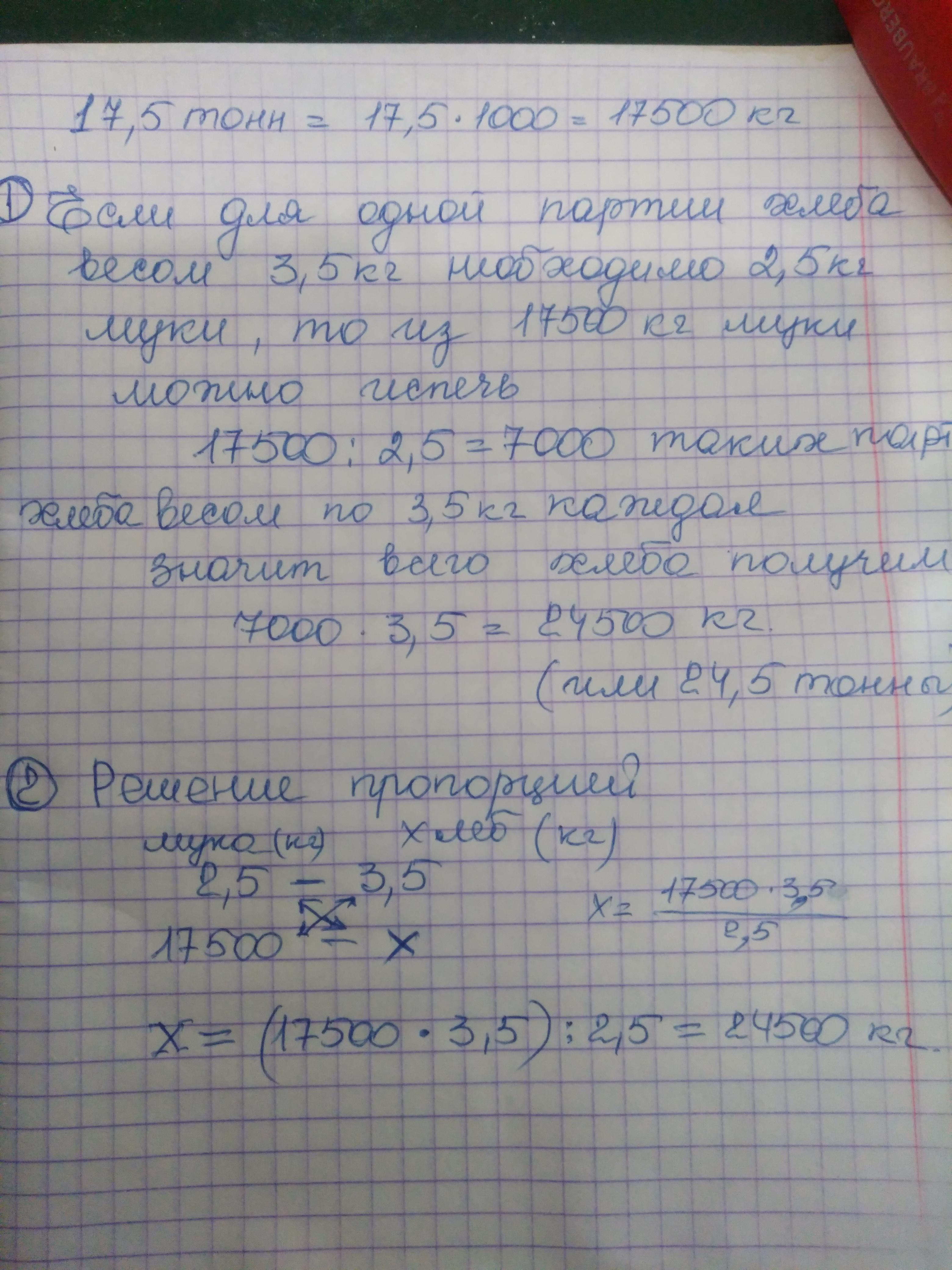на изготовление 3 1/2 кг хлеба требуется 2 1/2 кг муки сколько можно испечь из 17 1/2 тонн муки