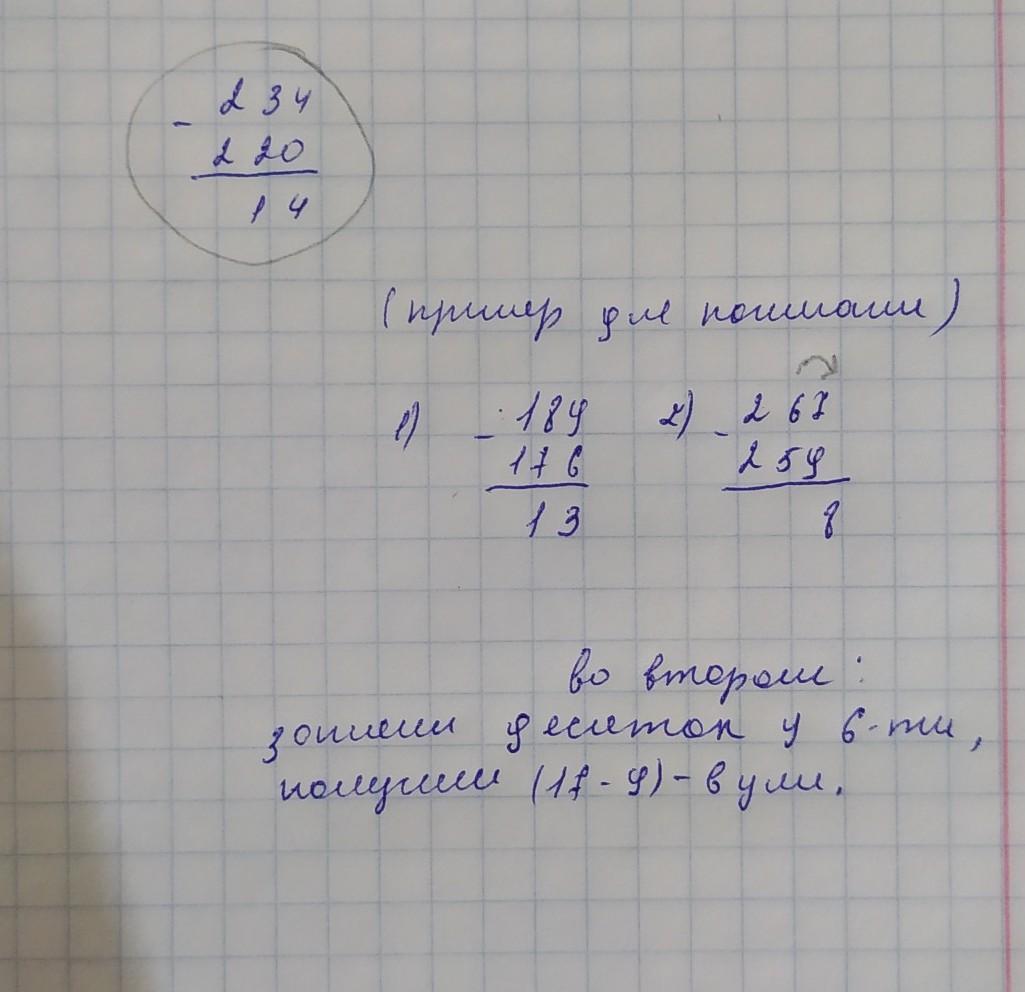 Во втором примере, т.к от 7, 9 отнять не можем, заняли десяток у 6, получили (17-9)- в уме это все держим и решаем, получилось 8. Там где было 6, осталось 5, так как забрали от туда для 7. Надеюсь понятно))))