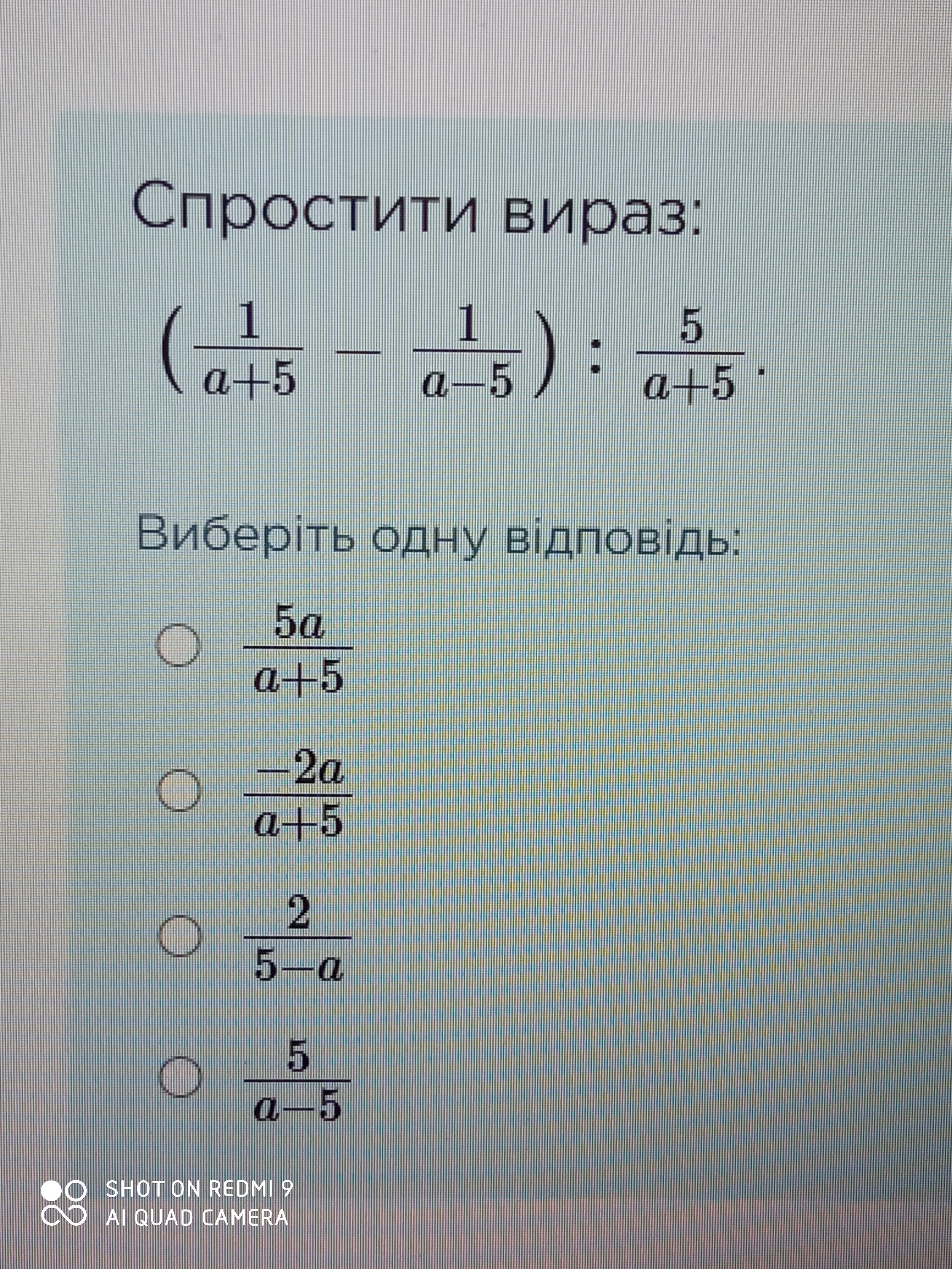 ( \frac{1}{a  + 5}  -  \frac{1}{a - 5}) \div  \frac{5}{a + 5}   =  (\frac{a - 5 - a - 5}{ {a}^{2}  - 25})  \div  \frac{5}{a  + 5}  =  \frac{ - 10( a+ 5)}{(a - 5)(a + 5)5}  =  -  \frac{2}{a - 5}  =  \frac{2}{5 - a}