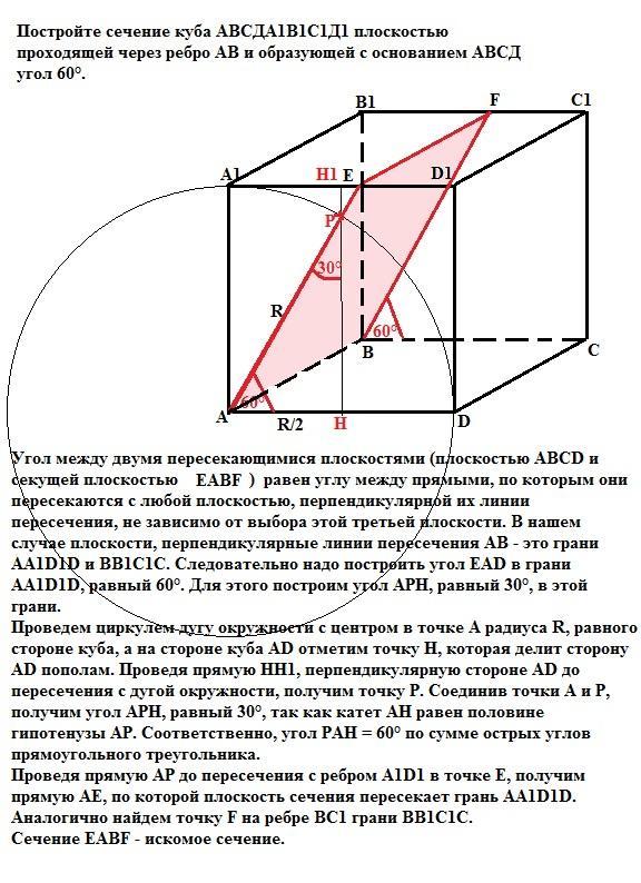 Постройте сечение куба АВСДА1В1С1Д1 плоскостью проходящей через ребро АВ и образующей с основанием АВСД угол 60