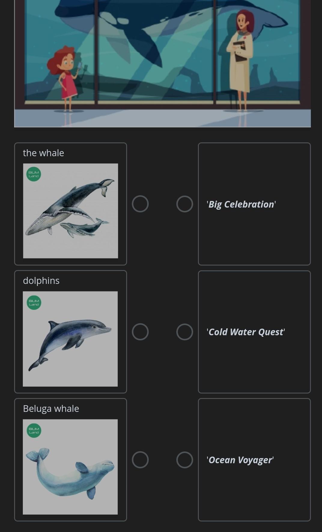 Listen to an online guide in a city aquarium and match the animal to their sections.