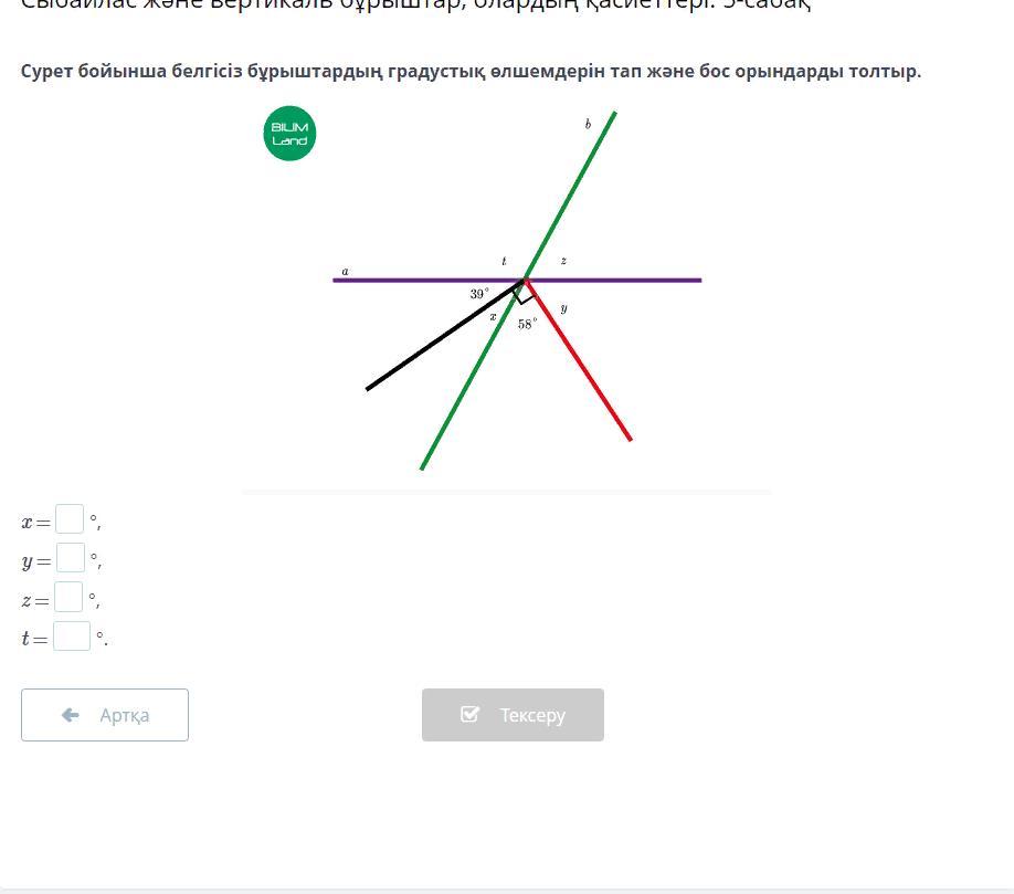 Найдите градусные размеры неизвестных углов по рисунку и заполните пробелы.