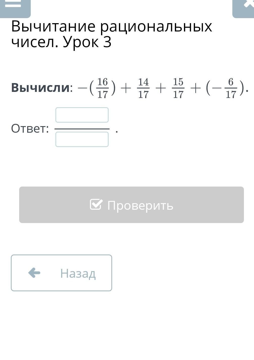 - 16/17 + 14/17 + 15/17 +(-6/17)= ( -16+14+15-6)/17= 7/17