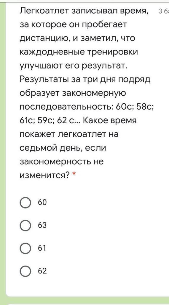легкоатлет записывал время за которое пробегает дистанцию и заметил что каждодневные тренировки улучшают его результат результаты за 3 дня подряд образуется закономерность последовательность 60 секунд 58 секунд 61секунд 59 секунд и 62 секунды Какое время покажет легкоатлет на седьмой день если закономерность не изменится?
