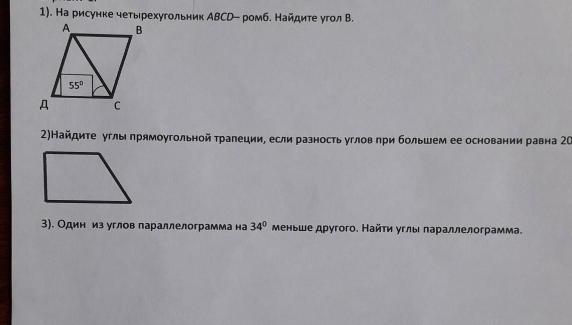 2)Найдите углы прямоугольной трапеции, если разность углов при большем ее основании 20 градусов