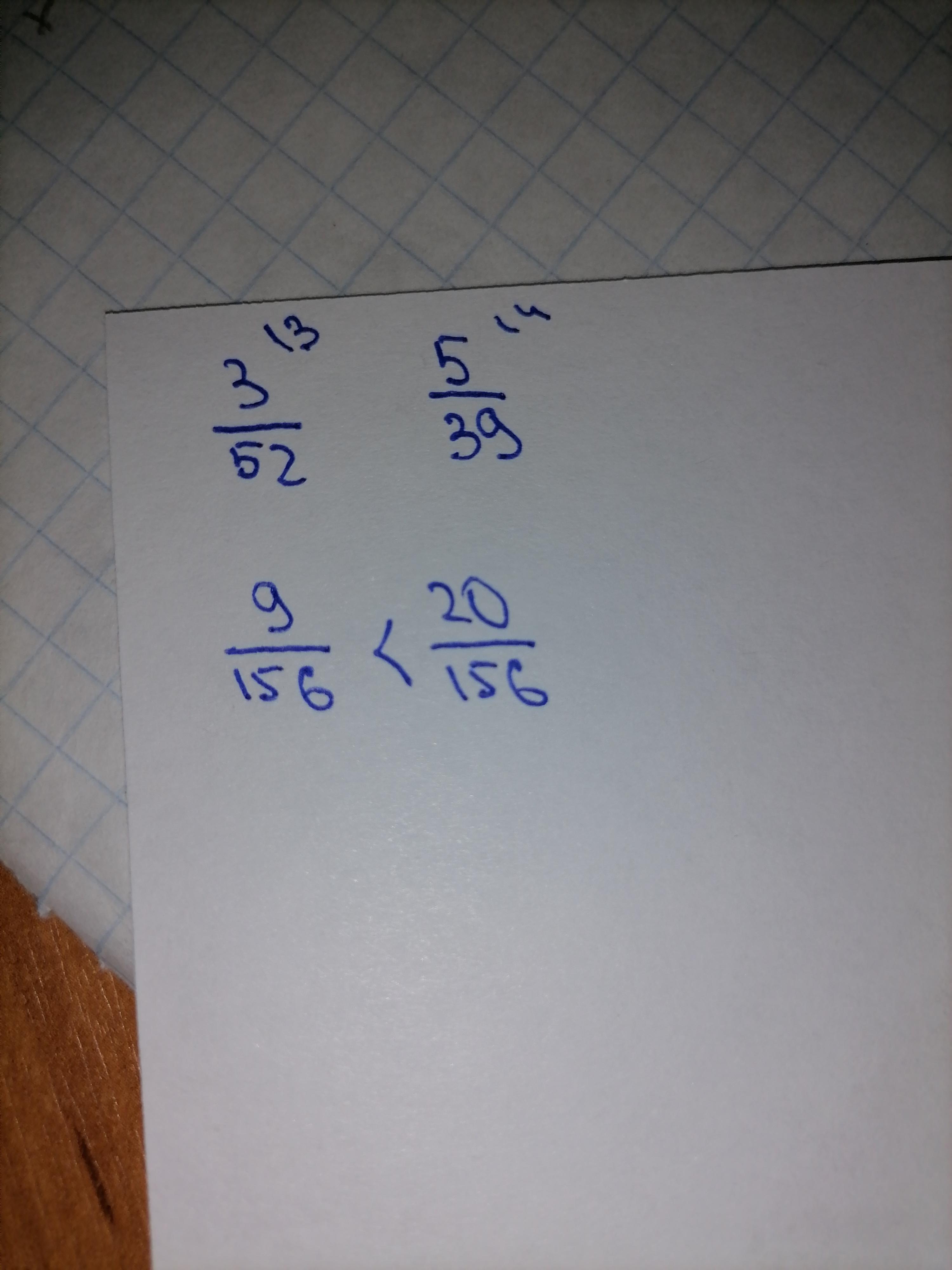 сравните дроби с разными знаменателями,приведя их к наименьшему общему знаменателю поставь знак больше меньше 3/52 5/39
