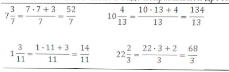например, 22 2/3-надо двадцать два умножить на знаменатель,т е на 3, будет 66 и прибавить числитель,т е 66+2 и будет 68/3-это четвёртый пример
