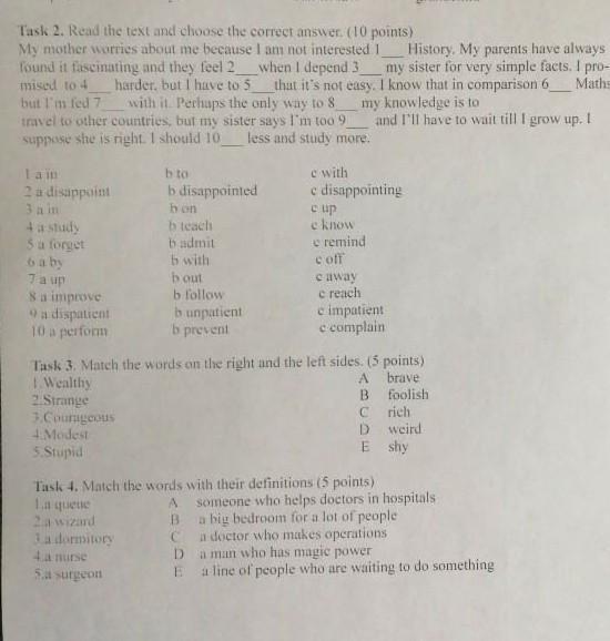 Task 2 Read the text and choose answer. My mother worries about me because I am not interested _____ History. My parents have always found it fascinating and they fell 2 ____ when I depend 3_______ my sister for very simple facts. I promised to 4 ______ harder , but I have to 5 _____ that it's not easy . I know that in comparison 6 _______ Math it is easier, but I'm fed 7 _______ with it. Perhaps the only way to 8 ______ my knowledge is to travel to other countries., but my sister says I'm too 9_________ and I'll have to wait till I grow up. I suppose she is right. I should 10 _____ less and study more.
