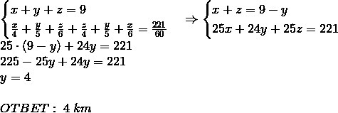 Пусть x км - подъём в гору, y км - ровный участок, z км - спуск с горы.